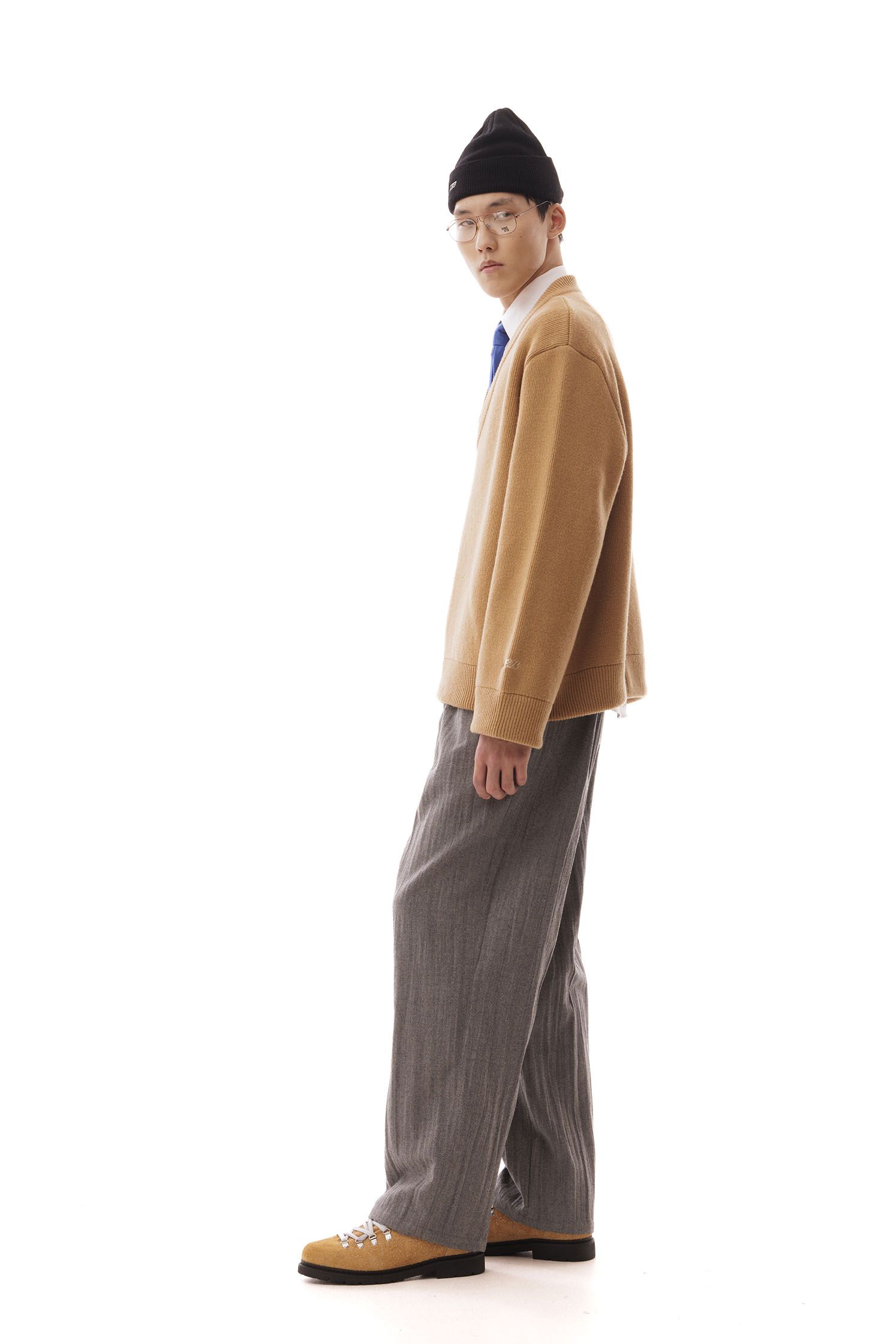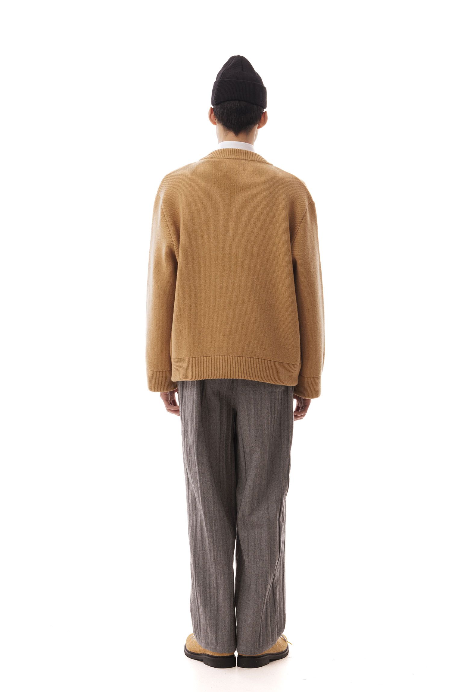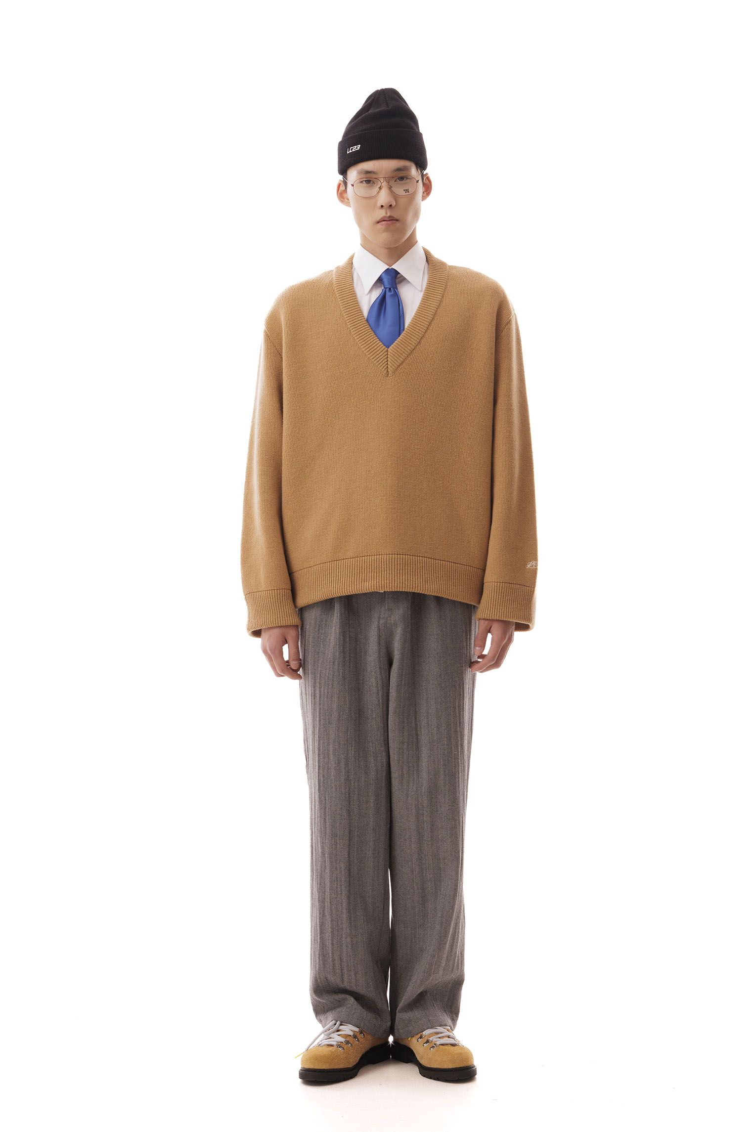 Wool V-neck, over fit, embroidered logo on the cuff